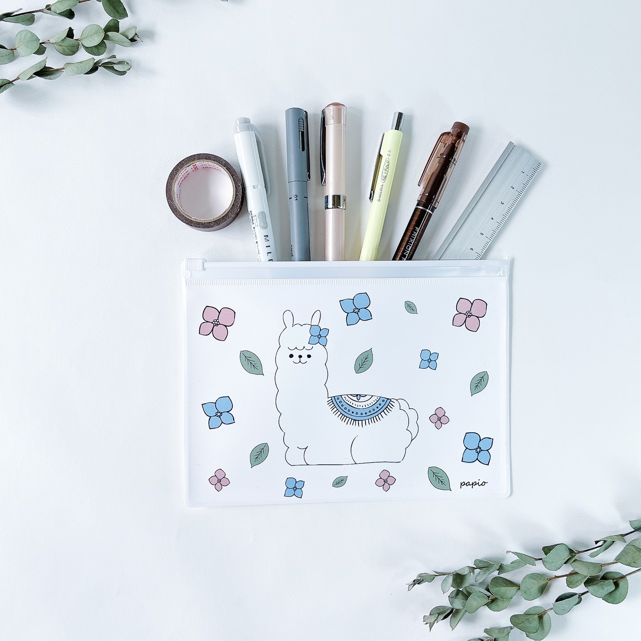紫陽花をつけてお座りをしたアルパカデザインのビニールポーチです!