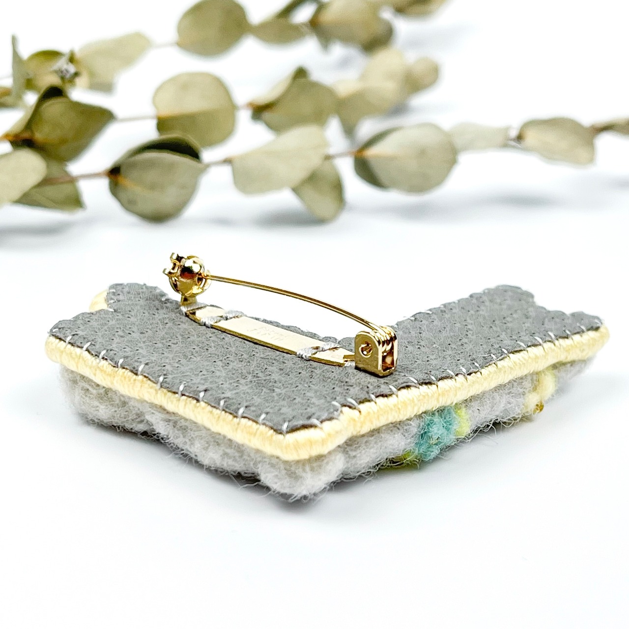 ブローチの側面は、刺繍糸でひと針ひと針丁寧に刺繍した巻かがりで縫っており、